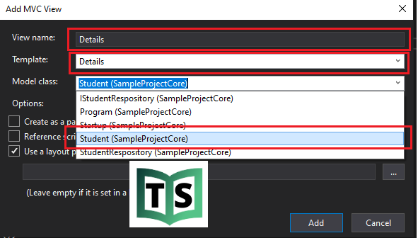 Provide the name as Details.cshtml and select the Template after that select model class Student.cs as we we need to display student details and click on the Add button to finish.